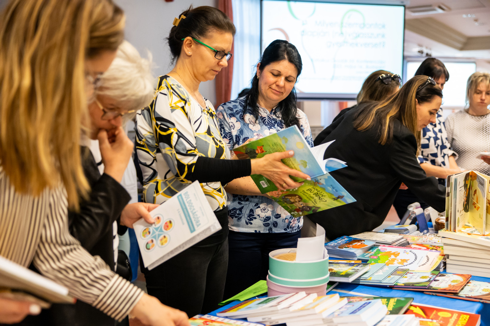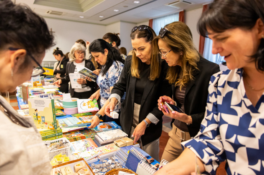 Az ebédszünetben a Korda Kiadó kínálatából könyveket, játékokat, apró kegytárgyakat vásárolhattak a kollégák és Kállai Nagy Krisztina is elhozta az általa illusztrált vallásos tárgyú köteteket eladásra.