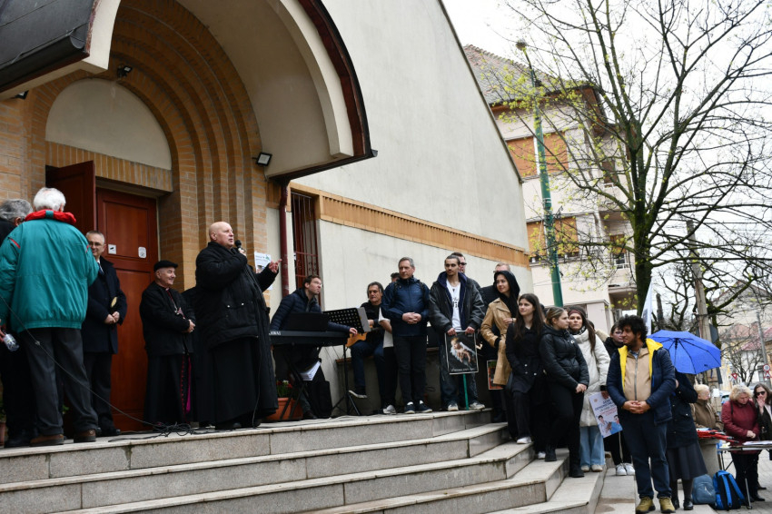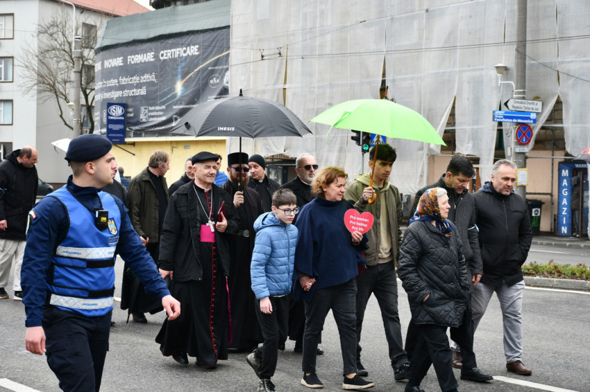 Mielőtt elindultak volna a Bega-parti város utcáin, sokan részt vettek a 10 órakor bemutatott szentmisén, amelyet a Szűz Mária, a Béke és Egység Királynője görögkatolikus templomban tartottak. Ezt követően beszédek hangzottak el, a meghívottak a templom lépcsőiről szóltak az egybegyűltekhez.