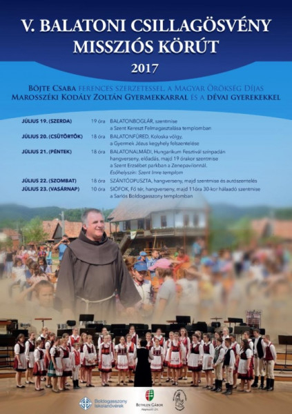 – július 21., péntek 18 óra Balatonalmádi, a Hungarikum Fesztivál színpadán hangverseny, előadás, majd 19 órakor szentmise a Szent Erzsébet parkban a Zenepavilonnál (esőhelyszín: Szent Imre-templom)
