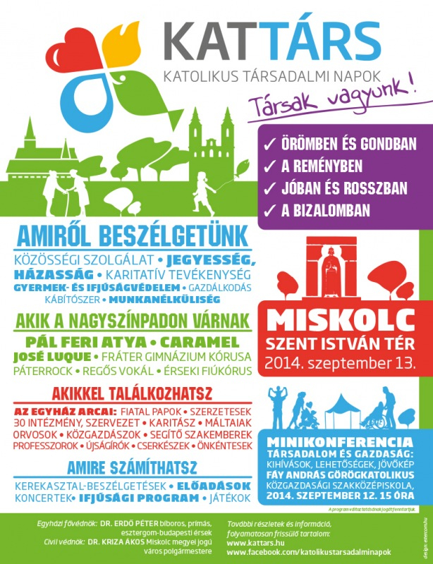 Kik gondoskodnak a rászorulók anyagi és lelki szükségleteiről? Melyik szervezet nyújt segítő kezet a hajléktalan, nincstelen embereknek? Mi az a halláspasztoráció, és mit jelent a hospice? Hogyan lehet katolikus kézzel gazdálkodni, és hogyan kommunikál az Egyház 2014-ben? Többek között ezekre a kérdésekre is választ kaphatunk az őszi Katolikus Társadalmi Napokon.