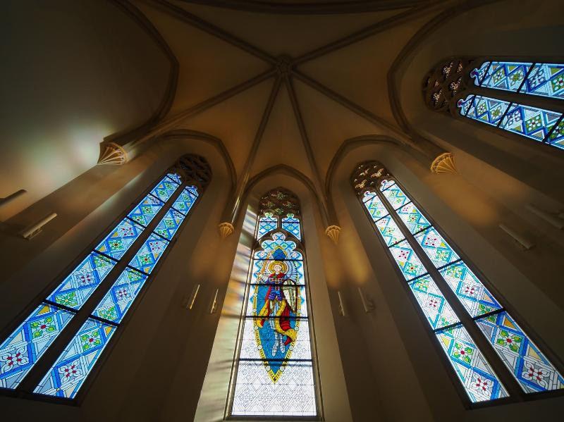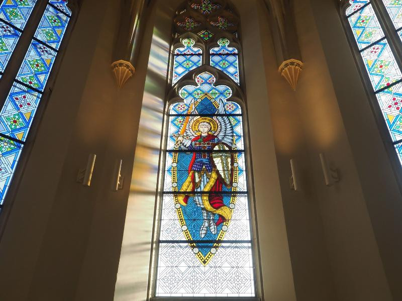 Részben elkészültek a Szent Mihály-főszékesegyház új színes üvegablakai is. A beruházás első fázisában elvégzett művészettörténeti kutatások kimutatták, hogy több, öt-hat különböző stílusú üvegablak volt az épületben. Az eredeti, Waltherr Gida által készített Szent Mihály-ábrázolás a II. világháború során súlyosan megrongálódott, melynek helyreállítását nem végezték el. Ezt követően Árkayné Sztehlo Lili műve került a helyére, aki jellemzően modernista belsőépítészeti terekhez készített ablakokat. Az 1950-es évektől elhelyezett üvegablakok stílusukban idegenek voltak a főszékesegyháztól; állapotuk sem volt kielégítő. Ebből adódóan a szakemberek kiemelésük és restaurálásuk mellett döntöttek, ezt követően liturgikus és múzeumi terekben kapnak helyet.