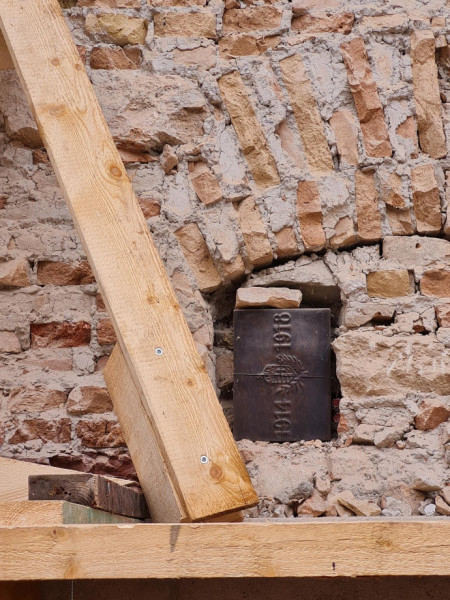 A győri székesegyház déli oldalfalán elhelyezett, a császári és királyi 19. gyalogezred hősi áldozatait megörökítő, Horváth Adorján által készített dombormű 1927. november 13-án történt megáldásáról a korabeli sajtó beszámolói alapján mindenki értesülhetett. Azt azonban már kevesebben tudhatták, hogy a dombormű elhelyezését megelőzően a falban kiképzett fülkében időkapszulát is elhelyeztek.