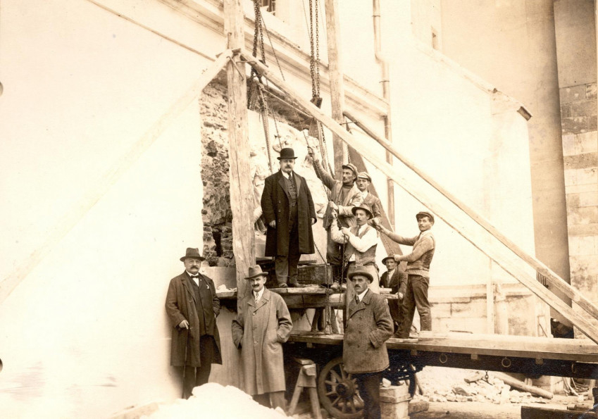 A felvételen balról jobbra: Klempa Kálmán, Müller Tivadar és Birkmayer János kőfaragó; az emelvényen Horváth Adorján szobrász a domborművet csigákkal felvonó munkásokkal.