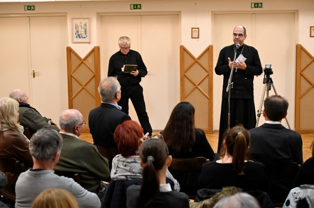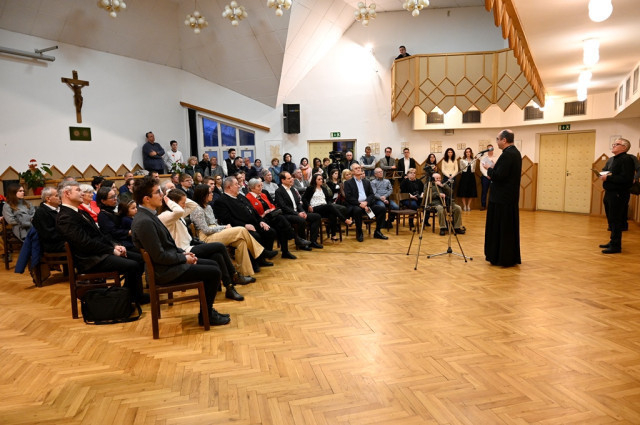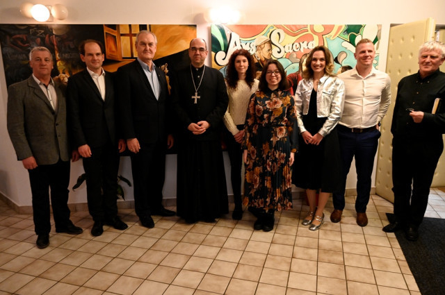 Harangozó Bertalan a KDNP nevében szólt a megjelentekhez. Megköszönte a művészeknek, hogy elfogadták a támogatásukat a kiállítás megrendezésére, amihez az egyházmegye is hozzájárult.