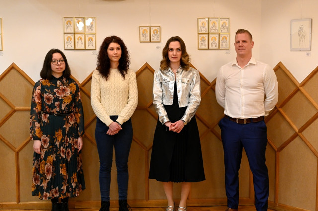 Végezetül Tóth Csaba Munkácsy-díjas festőművész megnyitójában Joseph Ratzingert, a későbbi XVI. Benedek pápát idézte, aki a liturgia szelleme című könyvében beszél a kép, a képzőművészet válságáról: „Ma nemcsak a szakrális művészetnek, hanem általában a művészetnek egy korábban ismeretlen méretű krízisét éljük át. A művészet válsága pedig azon emberlét krízisének a tünete, mely éppen az anyagi világ fölött való uralkodás legszélsőségesebb fokozásában olyan helyzetbe került, ahol az ember az anyagi természetű dolgokat meghaladó tájékozódási kérdések tekintetében vakká vált; ezt az állapotot lelki megvakulásként jellemezhetjük.” Épp ezért a négy fiatal kiállító, akik az ELTE Berzsenyi Dániel Pedagógusképző Központ hallgatói, a legnehezebbet választották, mivel a felvilágosodás óta a szakrális művészetet kiközösítették a mindenkori kortárs kultúrából...