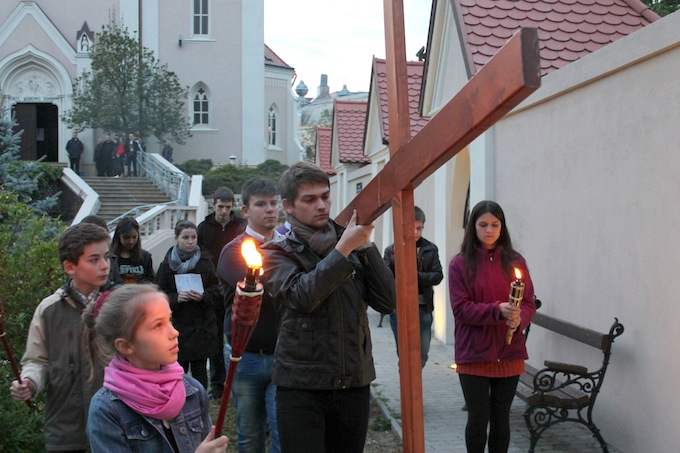 A Kálvária-templom udvarán este stációról stációra végigelmélkedték a résztvevő fiatalok a szenvedés történetét. A szabadtéren felcsendülő énekek, imák különlegessé tették a tavaszi estét, a fiataloknak szóló gondolatokban valós élethelyzetek, problémák jelentek meg, melyeket felold a Krisztus-kereszt titkának szemlélése.