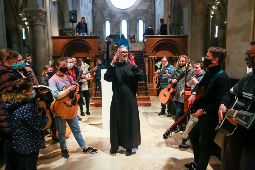 A találkozó résztvevőit ezután a bazilikába várták – dicsőítésre, napközi imaórára a bencés közösséggel, végül pedig egy záró gitáros flashmobra. Konrád atya bevezetett a szerzetesek napi gyakorlatába: „Az imaórákon Isten igéjének fényében nézünk rá életünkre. A zsoltárok szavaival imádkozunk, így olyan szavakat is kimondhatunk, amiket magunktól nem mondanánk. Szent István – akinek monostorunk alapítását köszönjük – elrendelte, hogy saját könyörgéseinket is hozzáfűzzük Magyarországért, a magyar jelenért és jövőért elmondott imához.”