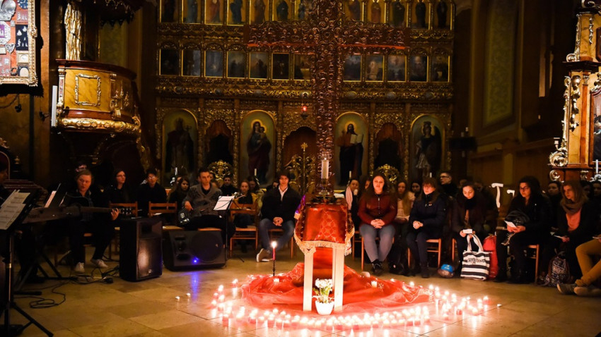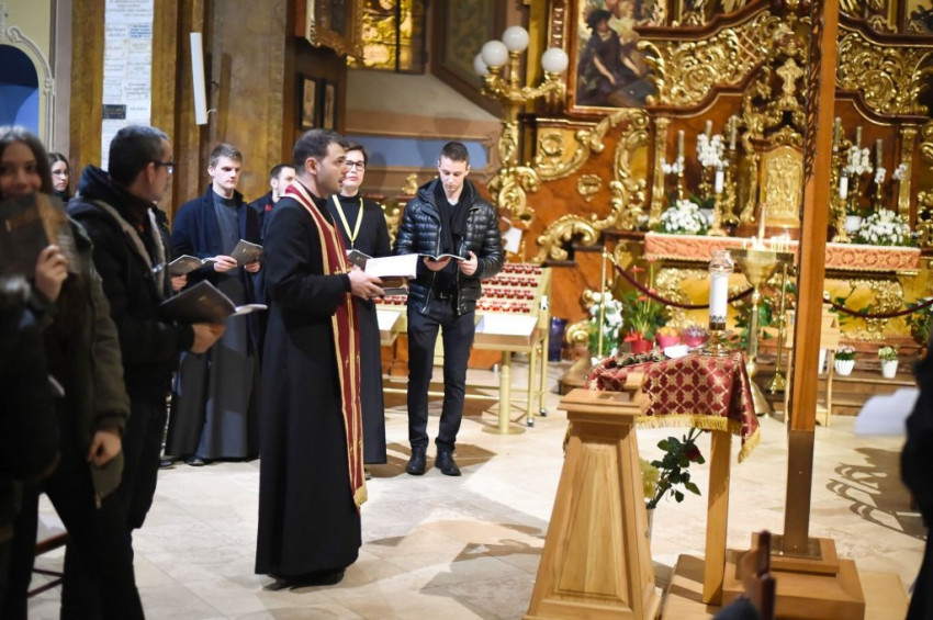Ezt követően a Szent Kereszt Akatiszt énekei hangzottak fel Kovács Csaba parókus, a Szent Miklós Görögkatolikus Gimnázium lelki igazgatója vezetésével, aki az állva végzett imádság után bemutatta Máriapócs spiritualitását és ismertette a kegyhely történetét. A virrasztás első részét Trella Tibor, a nagykállói Korányi Frigyes Görögkatolikus Gimnázium és Kollégium lelki vezetője zárta. Előadásában a kereszt mélységeit az ikonográfia motívumai és a bizánci himnuszköltők alkotásai segítségével mutatta be a fiataloknak.