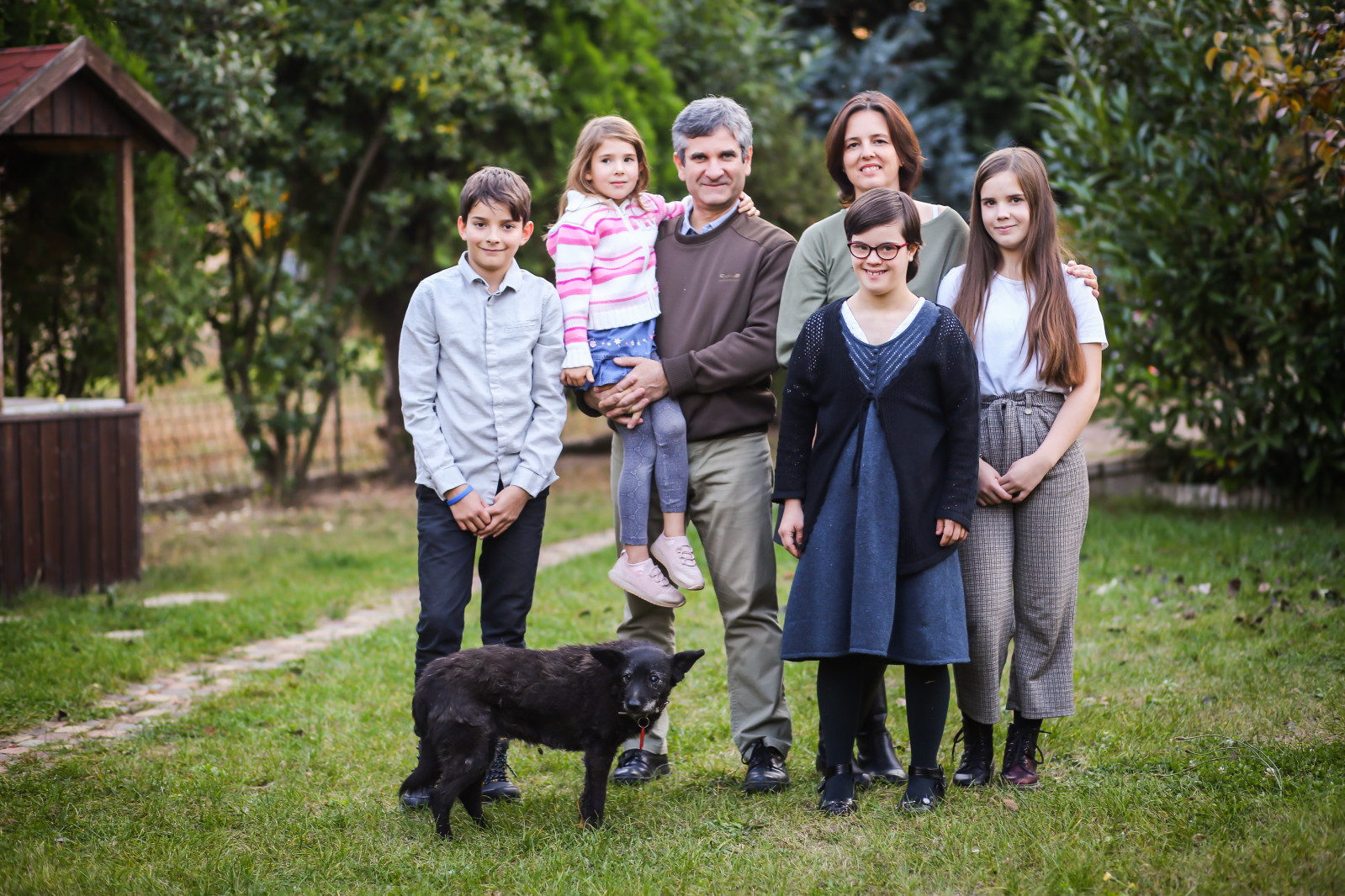 Otthonos kert fogad minket Kistarcsán és egy irigylésre méltó hangulatú ház. A matuzsálemi korban lévő, tizenhét éves Kökény kutya már nem siet, komótosan jön elénk. A tizennégy éves körtefa roskadozik a lédús gyümölcstől. Csenge születésekor ültették. Egy évvel korábban született Hanna, tizenkét éve Nándi, aztán hat évvel ezelőtt Juditka. (A számokat és a dátumokat mind Hannától tudom meg, látnivalóan imádja őket.) A család összeáll egy közös fotóra a lemenő nap surlófényében. Tökéletes a kompozíció, mindenkinek ott a helye, összetartoznak.