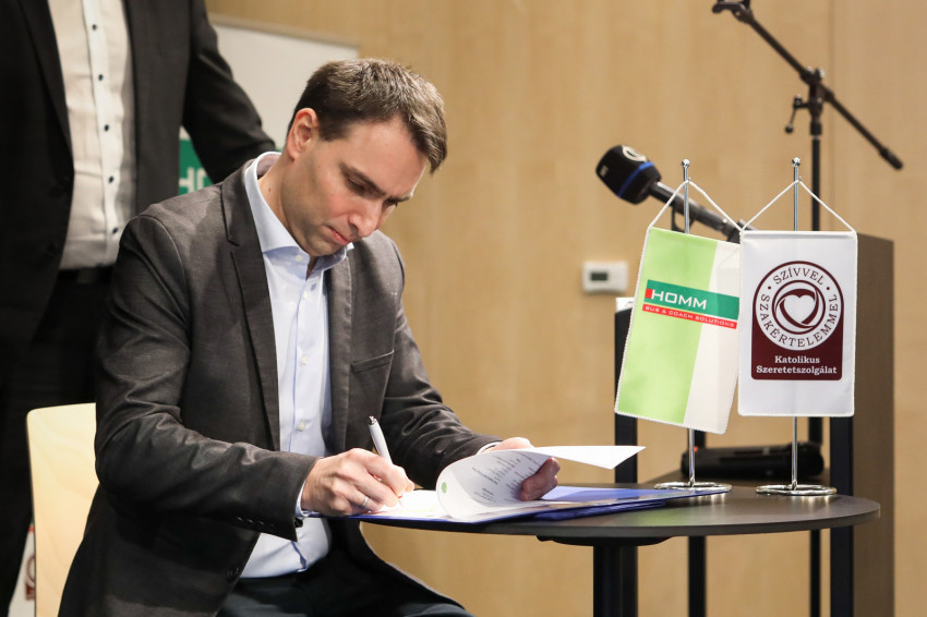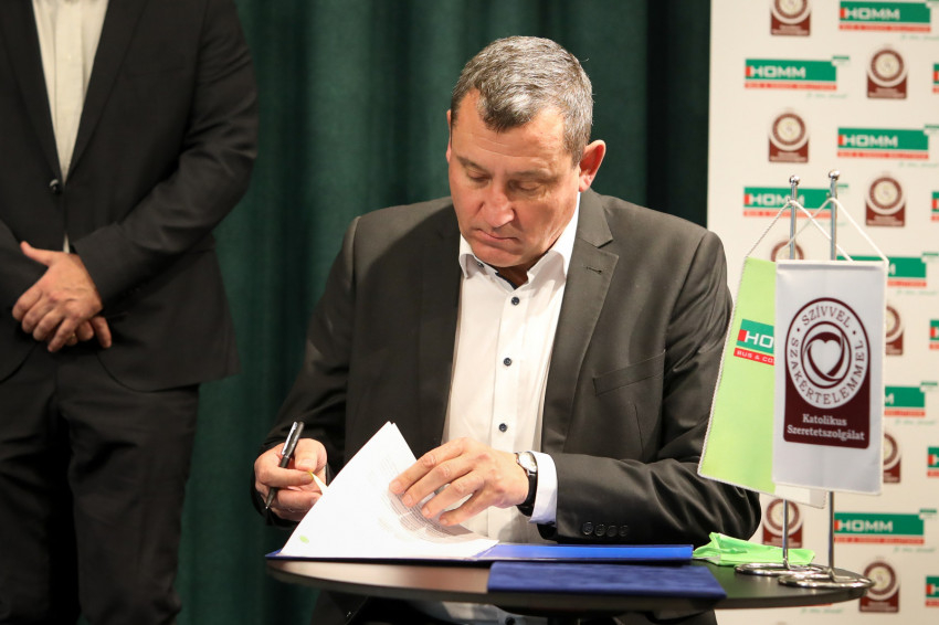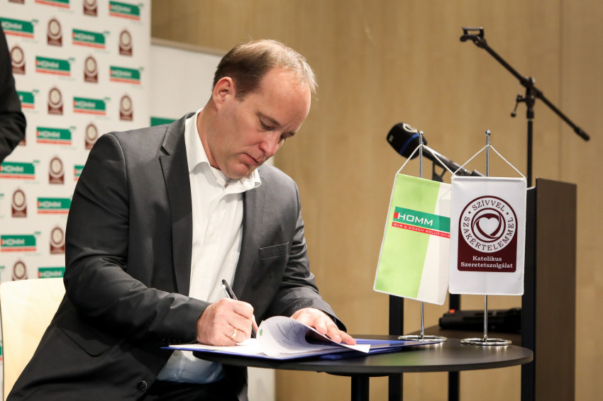 Ezután került sor a megállapodás ünnepélyes aláírására, amelyet Vajda Norbert, a Katolikus Szeretetszolgálat főigazgatója, valamint Homm Károly és Tóth Balázs, a HOMM Kft. ügyvezető igazgatói láttak el kézjegyükkel.
