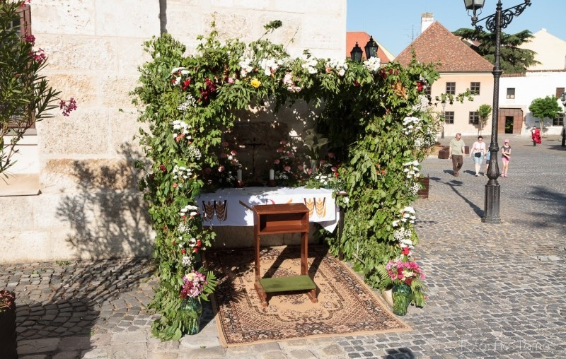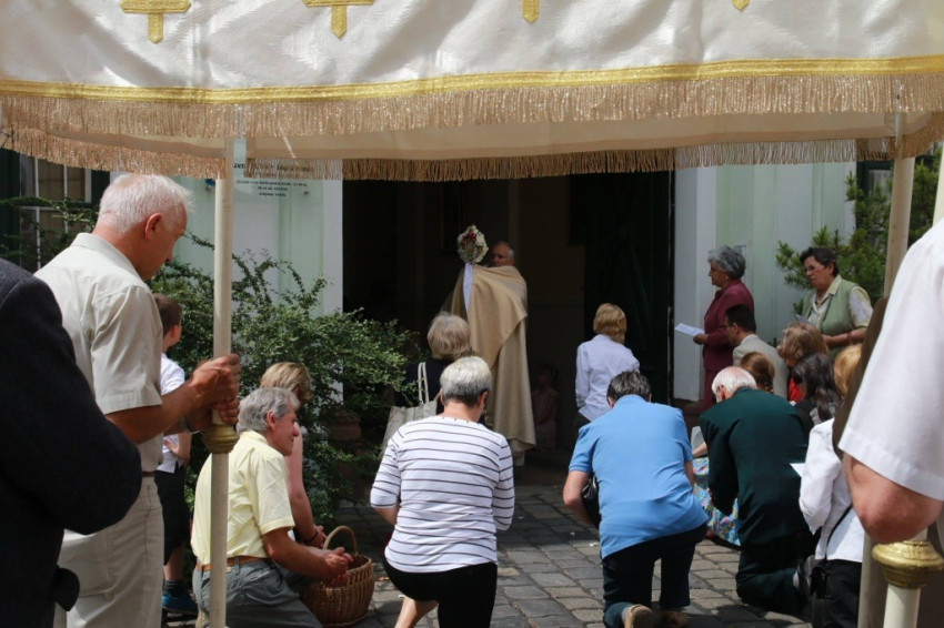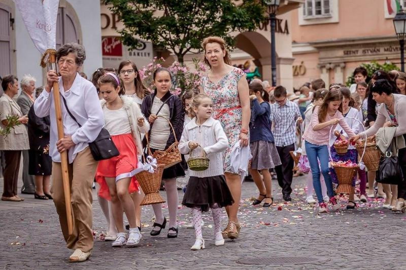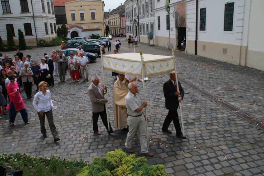 Veszprémben május 29-én Nagy Károly címzetes apát, kanonok, a Szent Mihály-bazilika plébánosa mutatott be ünnepi szentmisét a főtemplomban. A szentmise után a plébános körülhordozta az Oltáriszentséget a veszprémi várban, ahol négy oltárt állítottak fel a körmenet útvonala mentén. A kisgyermekek virágszirmokat szórtak, a hívek imádsággal és énekkel kísérték az Oltáriszentséget a virágdíszekkel kirakott ideiglenes oltárokhoz, amelyeket a Szaléziánumban, a főplébánián, az érseki palota előtt és a Szentháromság-szobornál állítottak fel. A negyedik oltárnál Nagy Károly az Oltáriszentséggel külön megáldotta a keresztség szentségében aznap részesült kisgyermekeket.