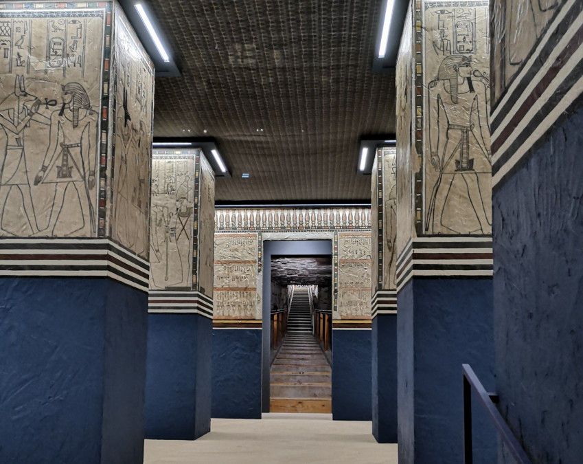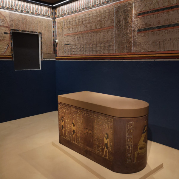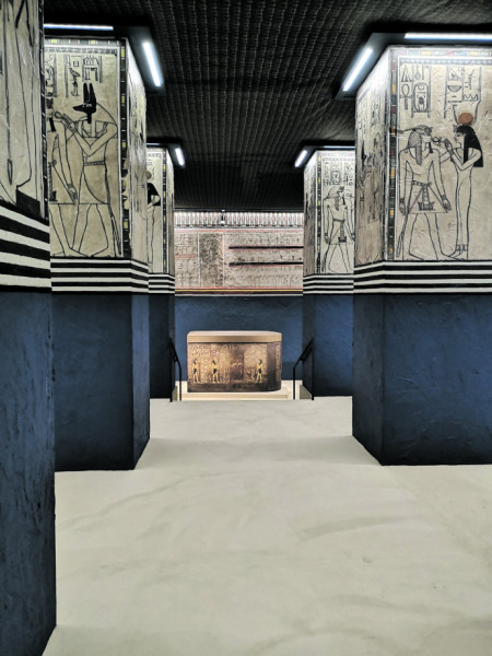 A tárlat koronája, látványossági csúcspontja, ahová a látogató egy stilizált útvesztő emelkedőjén át lép be: II. Amenhotep téglalap alapú, tekintélyes sírkamrájának méretarányos, valósághű rekonstrukciója. Vaskos négyzetoszlopokkal tagolt, festett falú terem, amelynek végében oltárszerűen helyezkedik el a fáraó (eredetileg kvarcit) szarkofágja. Itt persze semmi sem igazi. Közelről nézve kifejezetten kreált, díszletszerű 3D-vel, fotótapétával, fröccsöntött felületekkel. Ám a különleges föld alatti térélményt, a királysírok teljesen egyedi hangulatát, az ókori Egyiptom egy fenséges zugának impresszióját megadja ez a mű csarnok. Illúzió. Ha csak egy pillanatra is, de elhihetjük, hogy a Királyok völgyének „mélyében” járunk.