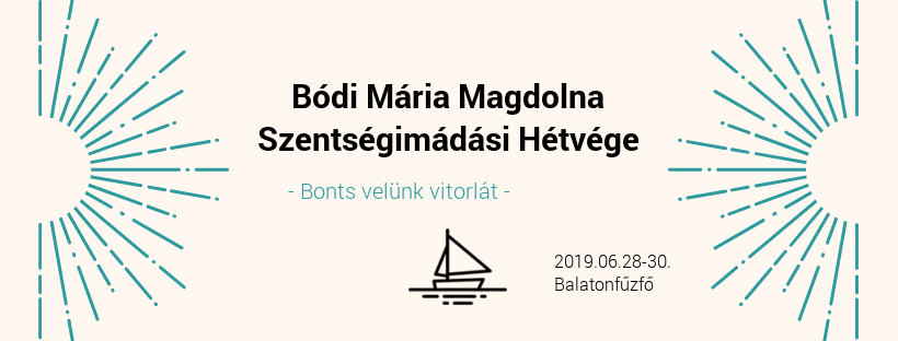 A Bódi Mária Magdolna Szentségimádási Hétvégét szervező fiatalok szeretettel várnak 2019. június 28. és 30. között a balatonfűzfői Jézus Szíve-plébánián megszervezett ingyenes nyári hétvégére, melynek keretében a folyamatos szentségimádás mellett hajnali áhítatokra, imákra, műhelyfoglalkozásokra, beszélgetésekre és Fábry Kornél, a Nemzetközi Eucharisztikus Kongresszus főtitkára, Béri László Renátó kármelita szerzetes, valamint Versegi Beáta Mária, a Nyolc Boldogság Közösség szerzetesnővérének előadására kerül sor.