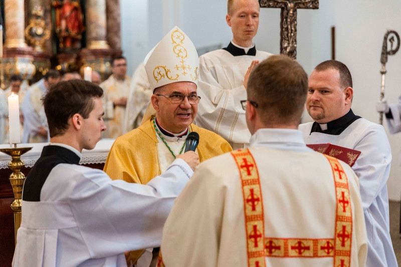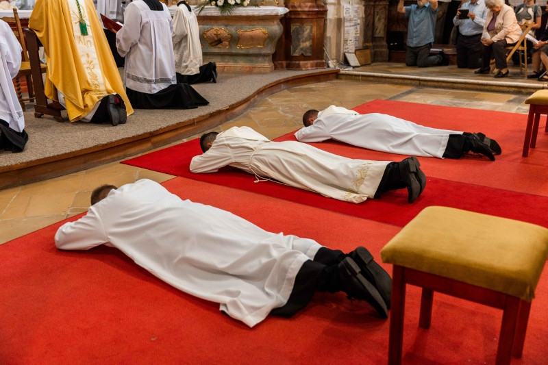 A szentbeszéd után a jelöltek engedelmességet fogadtak főpásztoruknak. A Mindenszentek litániája alatt arca borulva imádkoztak kérve a kegyelmeket szolgálatukhoz, amelyre ebben a szent pillanatban életüket szentelik.