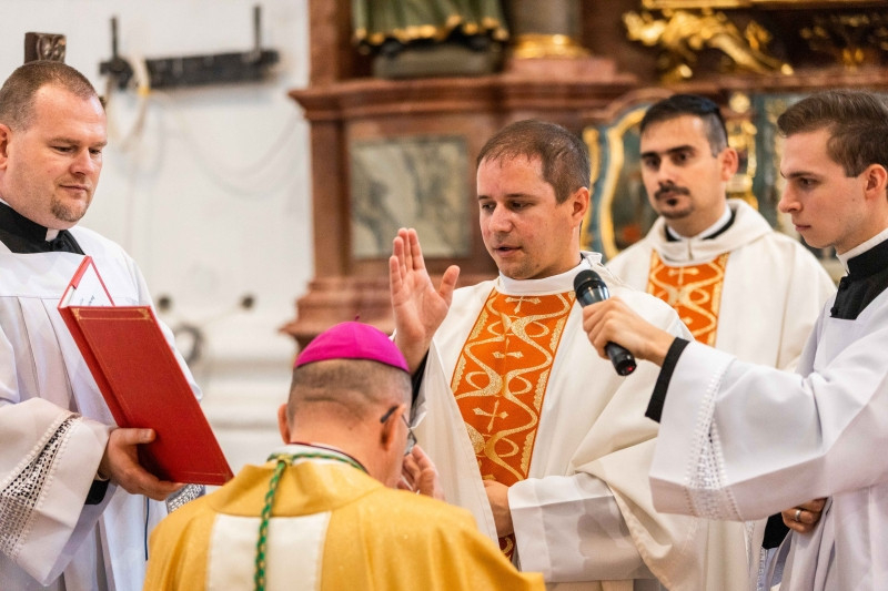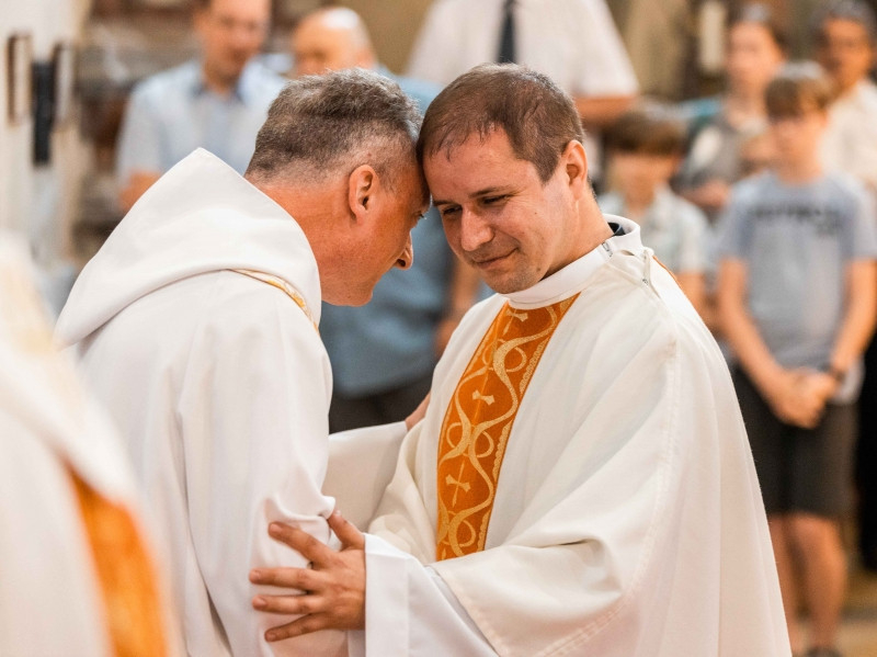 Ezt követte Szabó Gábor és Urbán Gábor diakónusok áldozópappá szentelése. Szép pillanata volt a szertartásnak, amikor a püspöki kézrátételt követően minden jelen lévő pap – mintegy negyvenen – kézrátétellel imádkoztak a szentelendőkért. A püspök felszentelő imáját követően az erre felkért és a hivatás felé vezető úton fontos szerepet betöltő paptestvérek palástot adtak a két újmisésre, majd azok átvehették a kelyhet, a paténát és rajta az ostyát papi szolgálatuk jelképeként. Először a püspök köszöntötte békecsókkal a frissen szentelteket, majd a felhangzó Tu es Petrus című Liszt-mű alatt a papok egymás után immár testvérükként köszöntötték a két papot.