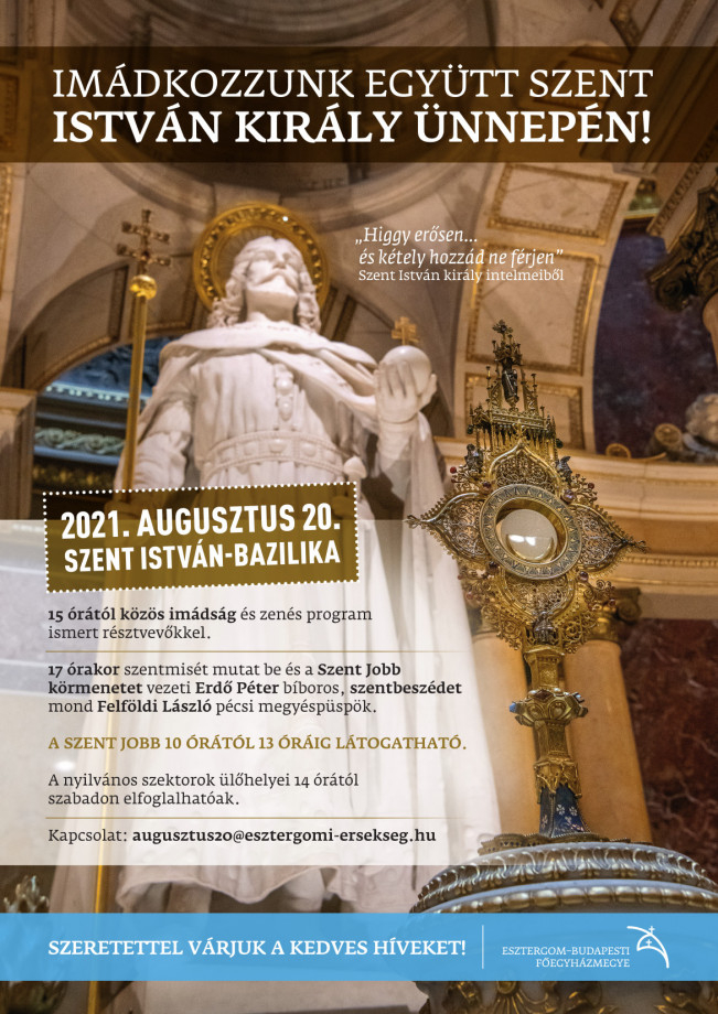 17 órától ünnepi szentmisét mutat be és a Szent Jobb-körmenetet vezet Erdő Péter bíboros, prímás, esztergom-budapesti érsek. A szentmise szónoka Felföldi László pécsi megyéspüspök lesz.
