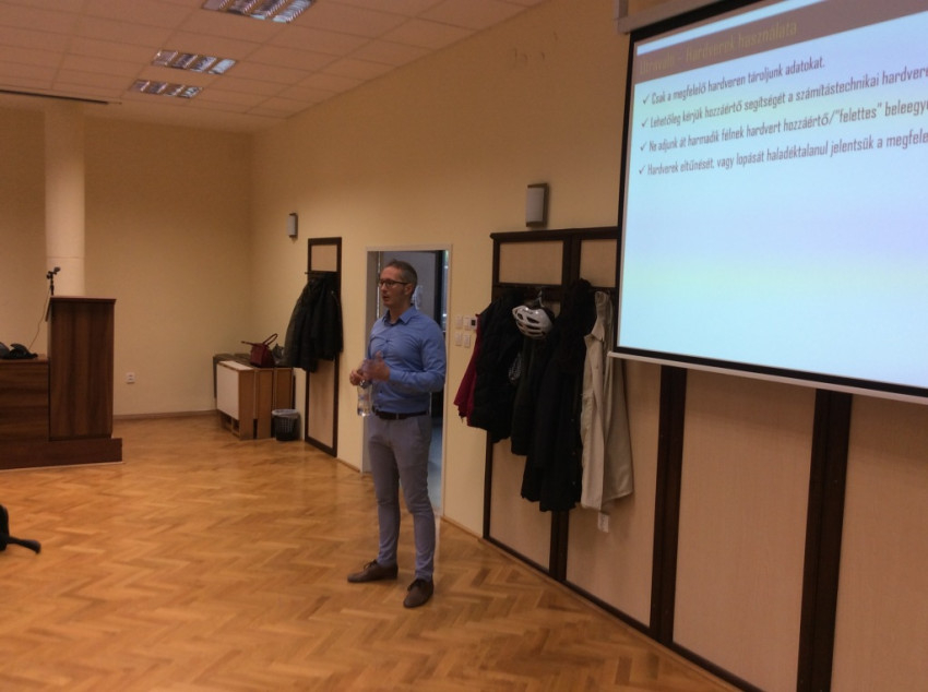 Az őszi évfolyam hallgatói mellett meghívást kaptak az alkalomra a tavaly végzett irodavezetők, valamint az Esztergom-Budapesti Főegyházmegye valamennyi plébánosa és intézményvezetője, illetve rajtuk keresztül informatikai szakembereik is. Az előadást Szabó Gábor, az Averisk Információbiztonság Mérnök Iroda ügyvezetője tartotta, aki komoly tudással rendelkezik a területen, lévén, hogy banki információbiztonsággal foglalkozik évek óta, mely az egyik legérzékenyebb terület az információk biztonságos kezelését illetően.