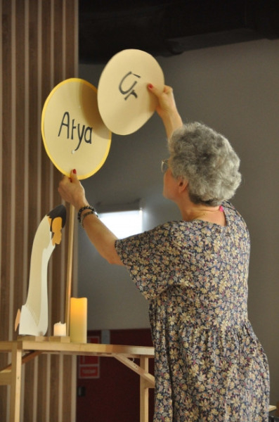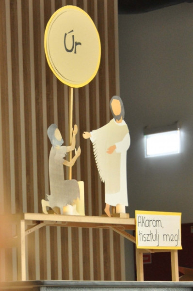 Rövid szünet után Emmanuelle Bonhomme a leprás meggyógyításának történetével foglalkozó bemutató órát tartott. A Szentlélek-hívó imát és a szentírási részlet felolvasását követően a történetet papírsziluettekkel szemléltették. A fontos kulcsszavakat feliratokkal is illusztrálták. Mindenki végiggondolhatta, hogy az adott helyzetben melyik szereplő mit érzett, mit és miért cselekedett, és ezeknek mi volt a következményük. A jelenet végén Jézus saját imáját folytatva a résztvevők is imába vihették át a bibliai példa őket megérintő tanulságait.