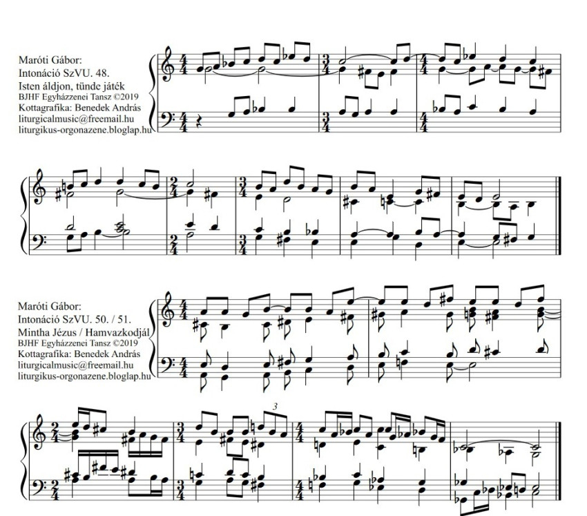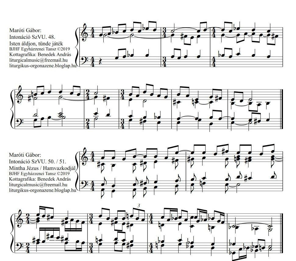 Maróti Gábor 130 darabból álló intonációgyűjteménye korábban közzétett részeinek – intonációk húsvéti népénekekhez; Urunk mennybemenetelétől úrnapjáig; az SzVU énektár évközi miseénekeihez (introitus, offertorium); a Nemzetközi Eucharisztikus Kongresszus alkalmából komponált intonációk az SzVU énektár Oltáriszentség-énekeihez; Nagyboldogasszony és Szent István király ünnepének intonációi; intonációk Mindenszentek főünnepére, halottak napjára és a gyászszertartásokhoz; az SzVU népénektár adventi népénekeihez; karácsonyi és újévi népénekekhez – kottáit a római katolikus liturgikus orgonazene honlapján érhetjük el: liturgikus-orgonazene.bloglap.hu.