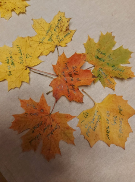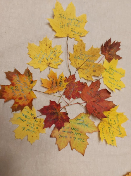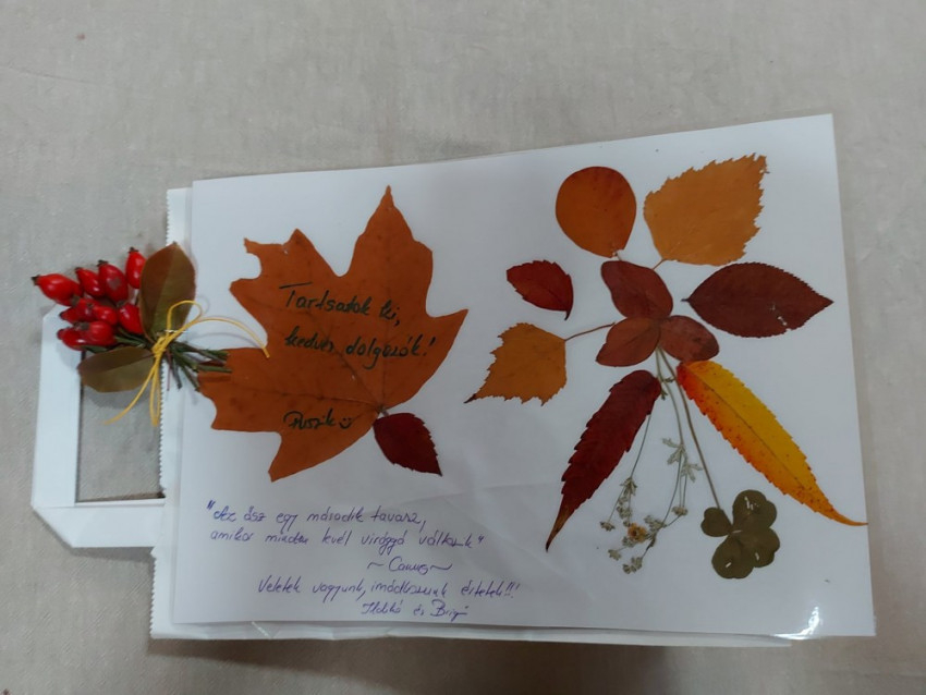 Az őszi erdőt járva a színkavalkádban egyszer csak világossá vált, mi lehet az új üzenési, levélírási forma: falevélen küldünk nekik bátorítást, mosolyt és egy kis szeretetet. Mivel a mostani világ egyre jobban hasonlít az archaikus időszakra, emiatt nem is volt bonyolult a régi levelezési formát feleleveníteni. A kórházi vezetőség és a dolgozók közreműködésével sikerült is eljuttattunk minden covidos betegnek egy-egy színes falevelet, néhány kedves sorral. Örültek neki, mosolyogtak, hálálkodtak. Reményeink szerint minél hamarabb az otthonaik ablakából látják már a szép őszi levélhullást.