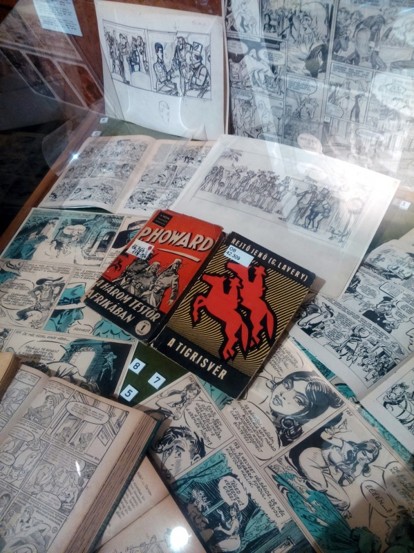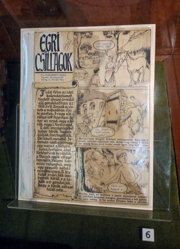 Több eredeti rajz is látható a kiállításon, de inkább újságnyomatok, illusztrált füzetek, plakátok, címlapok szerepelnek a tárlaton. Éppen ezért érdemes megnézni Korcsmáros Pálnak egy, az Egri csillagokhoz készült nyomdai eredetijét, kiszedett szövegekkel beragasztva.
