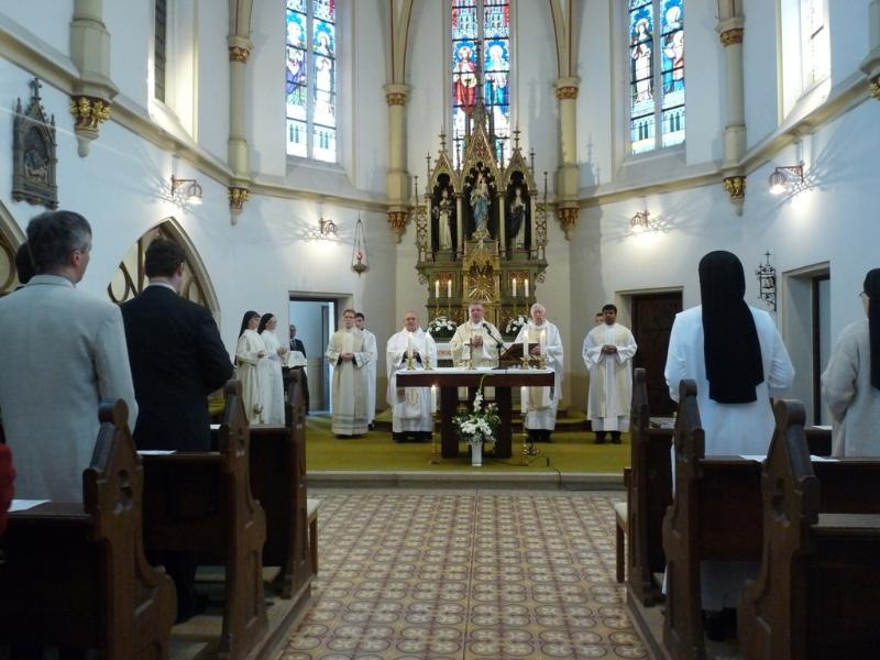A kápolna megáldását az ünnepi szentmise követte a zárdatemplomban, amelyen a megyéspüspökkel koncelebrált Harangozó Vilmos kőszegi esperes-plébános, Tete Remis SVD, az iskola lelkésze, Németh Norbert egyetemi lelkész, valamint Werner József SVD. A kollégium Aquinói Szent Tamás termében került sor az ünnepi köszöntőkre. Az üdvözlő szavak után az intézmény igazgatónője, Kakucs Petra nővér felolvasta Latorcai Csaba kiemelt társadalmi ügyekért felelős helyettes államtitkár beszédét, aki az M1-es autópályán történt baleset miatt csak később érkezett meg. A vendégeket Kőszeg alpolgármestere, Básthy Béla is köszöntötte.