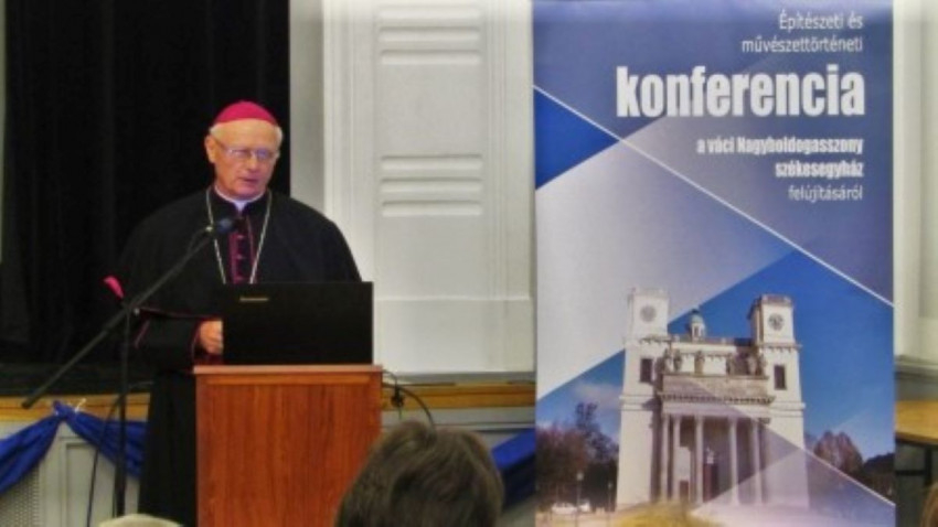 és ez a kötődés valamilyen formában időről időre meg is nyilvánul. Ilyen megnyilvánulás ez a szakmai konferencia is, amelynek létrejöttéért szívből köszönetet mondok a Vác Városért Alapítványnak és vezetőinek. Kívánom, hogy ez az esemény fűzze szorosabbá a kötődés imént említett szálait, gazdagítsa a székesegyház megújulásának folyamatát megalapozó és az ahhoz kapcsolódó szellemi megnyilvánulások sorát, s ha csak jelképesen is, töltsön be valamennyit abból az űrből, amelyet főtemplomunk jelenlegi átmeneti nélkülözése jelent mindannyiunk számára. Végül ezúton is szeretettel buzdítom mindazokat, akik a székesegyház megújításának munkájában részt vesznek, hogy motivációjukat ne annyira saját emberi munkájuk sikerében keressék, hanem mindenkor azt tartsák szemük előtt, hogy a közösség szolgálatára és Isten dicsőségére cselekednek, azok pedig, akik a megújulásnak külső szemlélői és várakozással tekintenek a felújítási munkálatok eredménye felé, kísérjék imádsággal a megújulás folyamatát” – fogalmazott köszöntőlevelében az egyházmegye főpásztora.