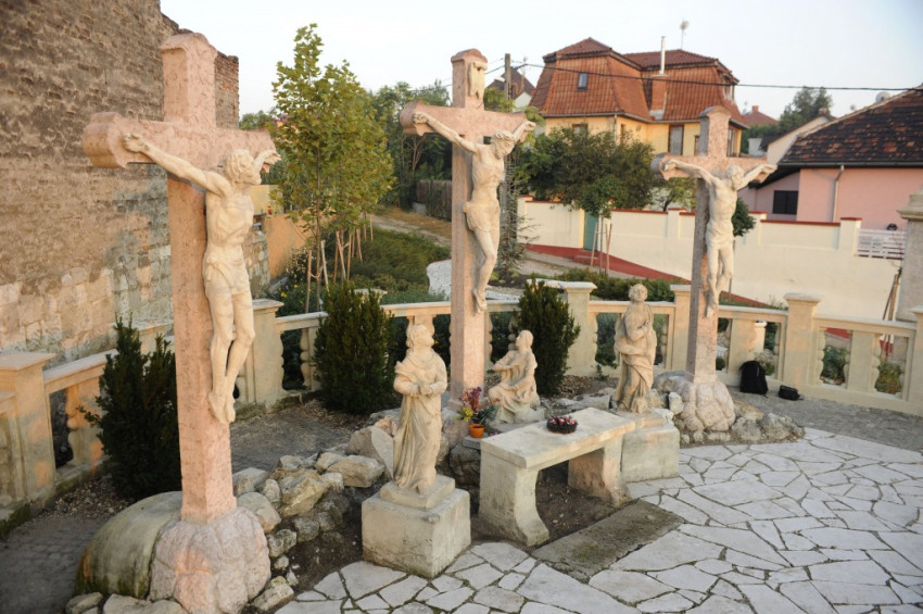 Budafok műemlék kálváriáját 1761-ben állították a helyi szőlőművesek. A három kereszt eredetileg vörösfenyőből volt, rajtuk Krisztus és a két lator festett bádogból. A keresztek előtt Szűz Mária, Mária Magdolna és Keresztelő Szent János ugyancsak festett bádogból készült alakja állt.