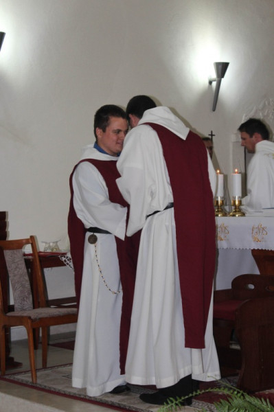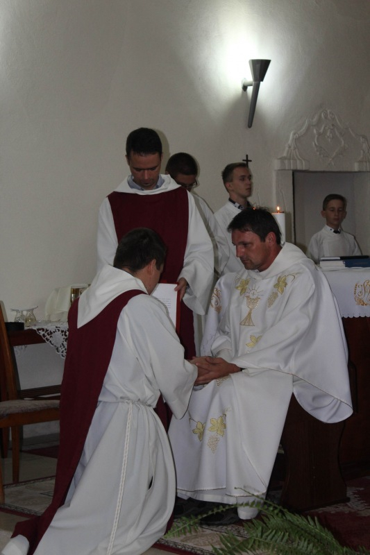 Ezután következett az a bensőséges pillanat, amikor Bálint testvér letette fogadalmát az elöljáró atya kezébe az evangéliumi hármas tanács – tisztaság, szegénység, engedelmesség – mellett, valamint negyedik fogadalomként életét ajánlva a tisztítótűzben szenvedő lelkekért és a földön a tisztulás útján járó lelkekért. Végül magára öltötte az engedelmességet jelképező övet és a testvérek imafüzérét.