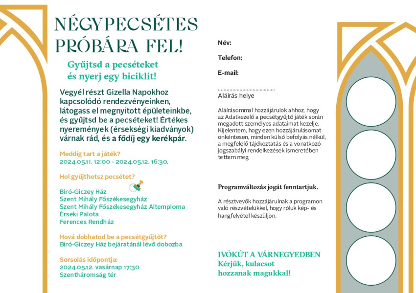 A főegyházmegye továbbá meghív mindenkit egy négypecsétes játékra, ahol a számos értékes nyeremény mellett a fődíj egy kerékpár.