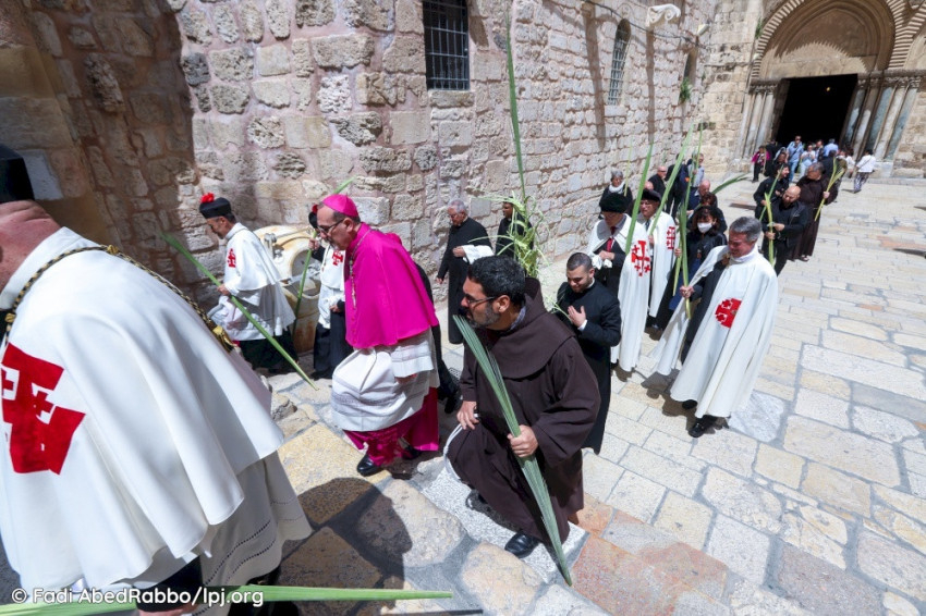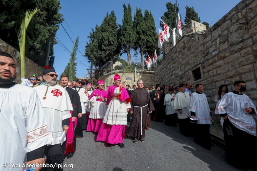 A menet a hagyomány szerint az Olajfák hegyéről, az egykori Betfagé helységet jelző ferences templomtól indult, ahonnan az Újszövetség szerint a szamár származott, melyen Jézus a városba érkezett. Az ünneplők élén a vallási vezetők, valamint hagyományos, még a török időkből fennmaradt öltözékeket viselő közösségi vezetők haladtak, akik számos helyi keresztény közösség színes zászlóját vitték.