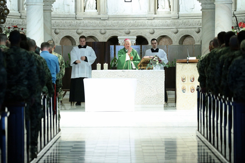 Prédikációjában arról beszélt, hogy az élet során szellemi fegyverekre van szükség, az üdvösség sisakjára, a hit kardjára és a megigazulás páncéljára annak érdekében, hogy túléljünk, fejlődjünk és egészségesek legyünk lélekben. Megjegyezte: annak érdekében, hogy az igazságot, az értékeinket, a hazánkat meg tudjuk védeni, nemcsak szellemi fegyverekre van szükség, hanem küzdeni és harcolni kell azért. Emlékeztetett, hogy a római hadseregben tilos volt kereszténynek lenni; csak 312-ben, a Milvius-hídi csata előtt járult hozzá Nagy Konstantin római császár ahhoz, hogy akik eddig titokban viselték a keresztet, azok zászlóra tűzhessék, jelvényként viselhessék. Hozzátette, a kereszt jegyében győzött és szabadult fel a kereszténység.
