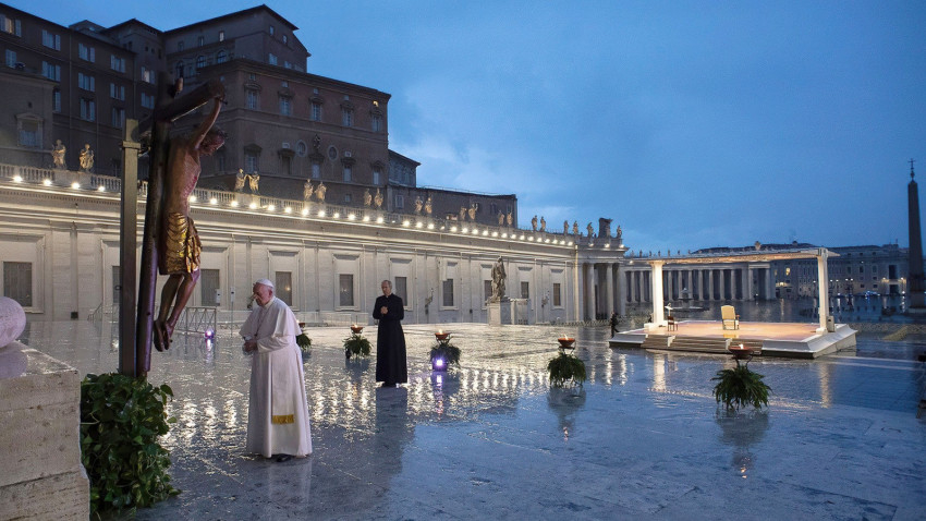 Fotó: Vatican News (Ferenc pápa 2020. március 27-én imát vezetett és rendkívüli, teljes búcsúval járó Urbi et Orbi áldást adott a Szent Péter-bazilika előtti üres téren, a világméretű koronavírus-járvány idején Isten irgalmába ajánlva Róma városát és az egész emberiséget).