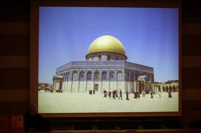 Az előadásra kis számú, de a téma iránt érdeklődő közönség gyűlt össze. A remek, modern teremben hatalmas képeket lehet vetíteni, és ezt az előadó jól ki is használta, aki egy kis sétát ígért a hallgatóságnak a jeruzsálemi templomtéren és környékén. „Több oldalról is meg lehet közelíteni a témát: van, aki az újságok aktualitásai felől; van, aki a közeli és távoli múltjából indul ki; vannak, akik a vallási szempontot tartják fontosnak. Mi keresztény módon nézzük a látottakat. A Dominus Flevit-kápolna lesz a visszatérő pontunk az Olajfák hegyének oldalában, ahonnan Jézus, szenvedését megelőzően, ránézett Jeruzsálemre, és elsírta magát. A templomteret innen, ennek a Jézusnak a szemszögéből szeretnénk megközelíteni” – mondta bevezetőjében Várnai Jakab, a Sapientia Főiskola rektora.