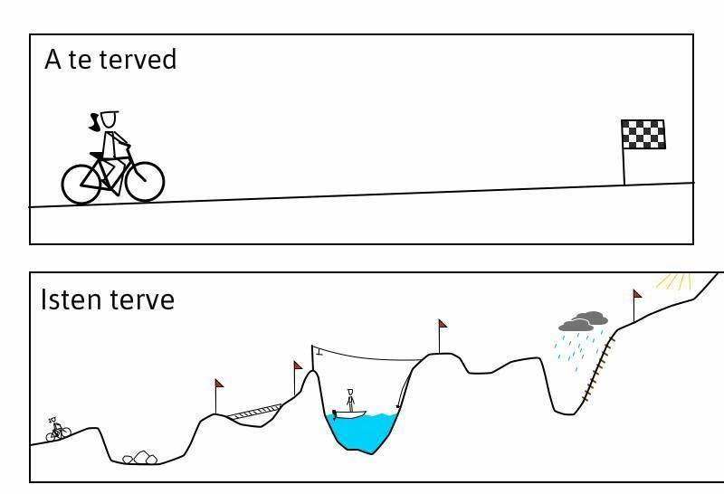 Az isteni tervben azonban van bőven. Ami viszont nincs: az a célt jelző kockás zászló. No meg a kép végét sem zárja le a megnyugtató, fekete vonal. Úgy tűnik, Isten olyan, mintha az egykori Skála Kópé tőle tanult volna: nála mindig történik valami. Ráadásul – a kép tanúsága szerint – olyan akadálypályát épít, hogy az extrém kalandparkok építőinek is tőle kellene tanulniuk. Hegyek és völgyek. Őrületes emelkedők és lejtők. Majdnem ember nagyságú kövek. Mélységes mély tó, kötélpálya és falmászás. Amikor pedig sokadjára is újabb sziklák megmászása és veszélyes lejtmenet jön, még fekete fellegek, szakadó eső és meredek lépcső is felbukkannak. Közben pedig folyamatosan csak a résztávokat jelző kis zászló lehet a legnagyobb eredmény.