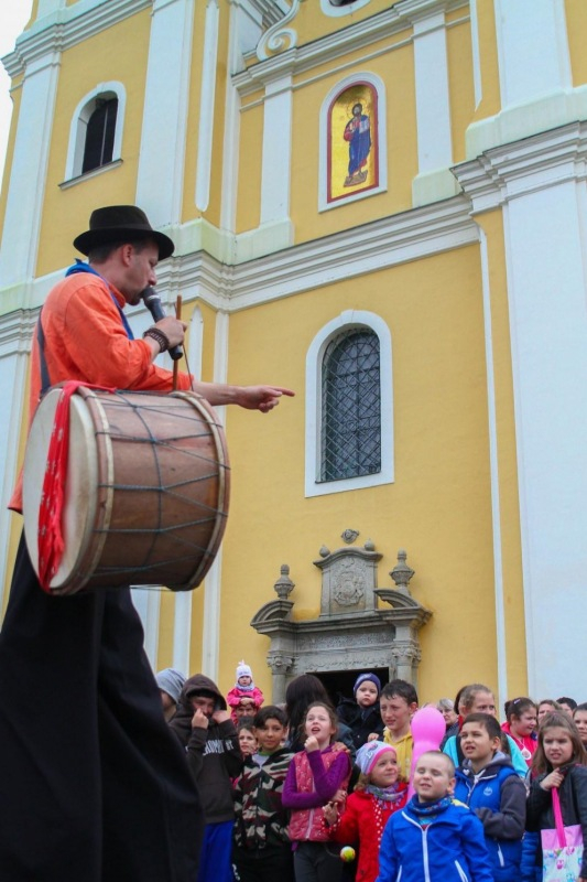 A liturgiát követően a Garagulya Gólyalábas Kompánia tartott bemutatót a kegytemplom előtt, a gyerekek nagy örömére.