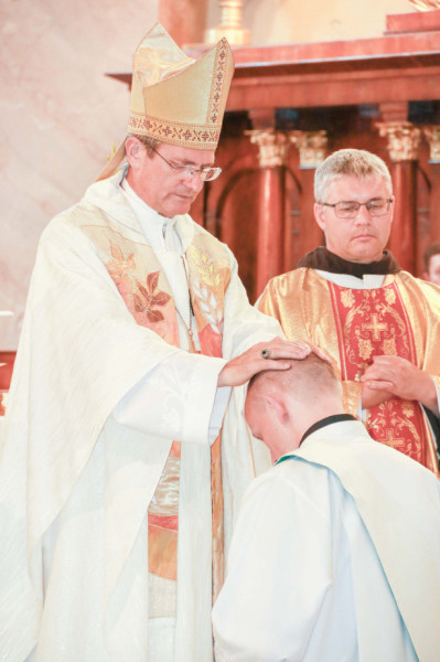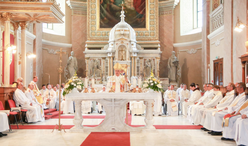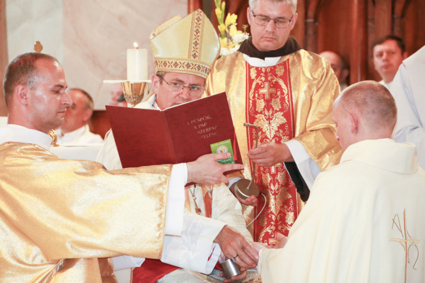 Homíliájában Schönberger Jenő püspök emlékeztette a szentelendőket, a papokat és a híveket, hogy a pap maga ajándék, de ajándékközvetítő is egyben. „Ti bátran jelentkeztetek Krisztus hívó szavára, hogy beálljatok abba a munkába, amiről az Úr Jézus így beszél: »az aratnivaló sok, a munkás kevés«. Köszönöm, hogy vállaltátok ezt a hivatást. Köszönöm, hogy egy életet akartok erre áldozni. Nagyon sokan várnak benneteket. Hiszem, hogy nagyon sokan imádkoznak is értetek. Azok a szentírási részek, amelyeket ti választottatok erre a jeles alkalomra, először is benneteket bátorítanak. Isten veletek van és mindig veletek lesz, nem kell félnetek. Ha a világ minden ereje ellenetek is mozdulna, Krisztussal mindig a többség lesztek, ha mellette kitartotok. Krisztus kegyelmében bízva menjetek előre. Amikor szembesülünk a saját gyengeségeinkkel, hiányosságainkkal, megijedünk. De bízzunk a kegyelemben és a Lélek általunk működni fog. A papság, a pap ajándék. Jézus akarta, hogy a munkában segítőtársai legyenek, az apostolok, azok utódai és a papok osszák ki az embereknek Isten kegyelmi ajándékait. Ez a pap feladata, és jó, ha ezt a kedves hívek is végiggondolják, ha úgy tekintenek a papra, hogy ő Krisztus ajándéka. Kedves fiaim, legyen nyilvánvaló életeteken az, hogy Krisztust követitek, őt szeretitek. Azt a Krisztust, aki meghívott benneteket Egyháza, illetve a hívek szolgálatára. Elsődleges dolgotok az legyen, amit Krisztus kér, és nem csak tőletek: hogy szentek legyetek.”