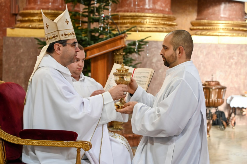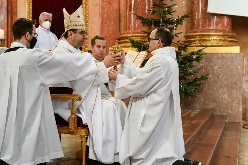 A jelöltek egyesével léptek előre, majd letérdeltek a kelyhet tartó főpásztor elé. „Vedd ezt az Eucharisztia ünneplésére előkészített kenyeret, és úgy élj, hogy méltóképpen szolgálhass az Úr és az Egyház asztalánál!” – bízta rájuk a küldetést Székely János.