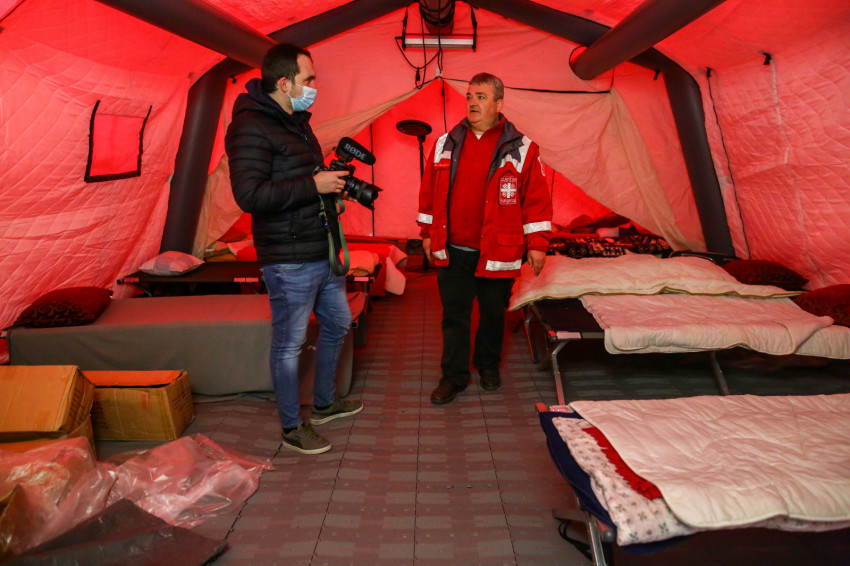 A kertben két nagy sátor áll. Az egyik fűthető légkamrás sátor, benne tábori ágyak. Itt alszik a 8-10 karitászmunkatárs, köztük Árvai Ferenc, Zagyva Richárd, az országos Karitász igazgatóhelyettese, Oláh Tamás, a Nyíregyházi Egyházmegyei Karitász igazgatója, Vadász Bálint, a győri karitász munkatársa, Veres József, az abasári karitász vezetője és Pásztor Gergely, a nyíregyházi csoport munkatársa. A másik sátor olyan, mint egy vegyesbolt. Tartós élelmiszer, tisztítószerek, takarók, babakocsik, ruhák, sőt még állateledel is van itt.