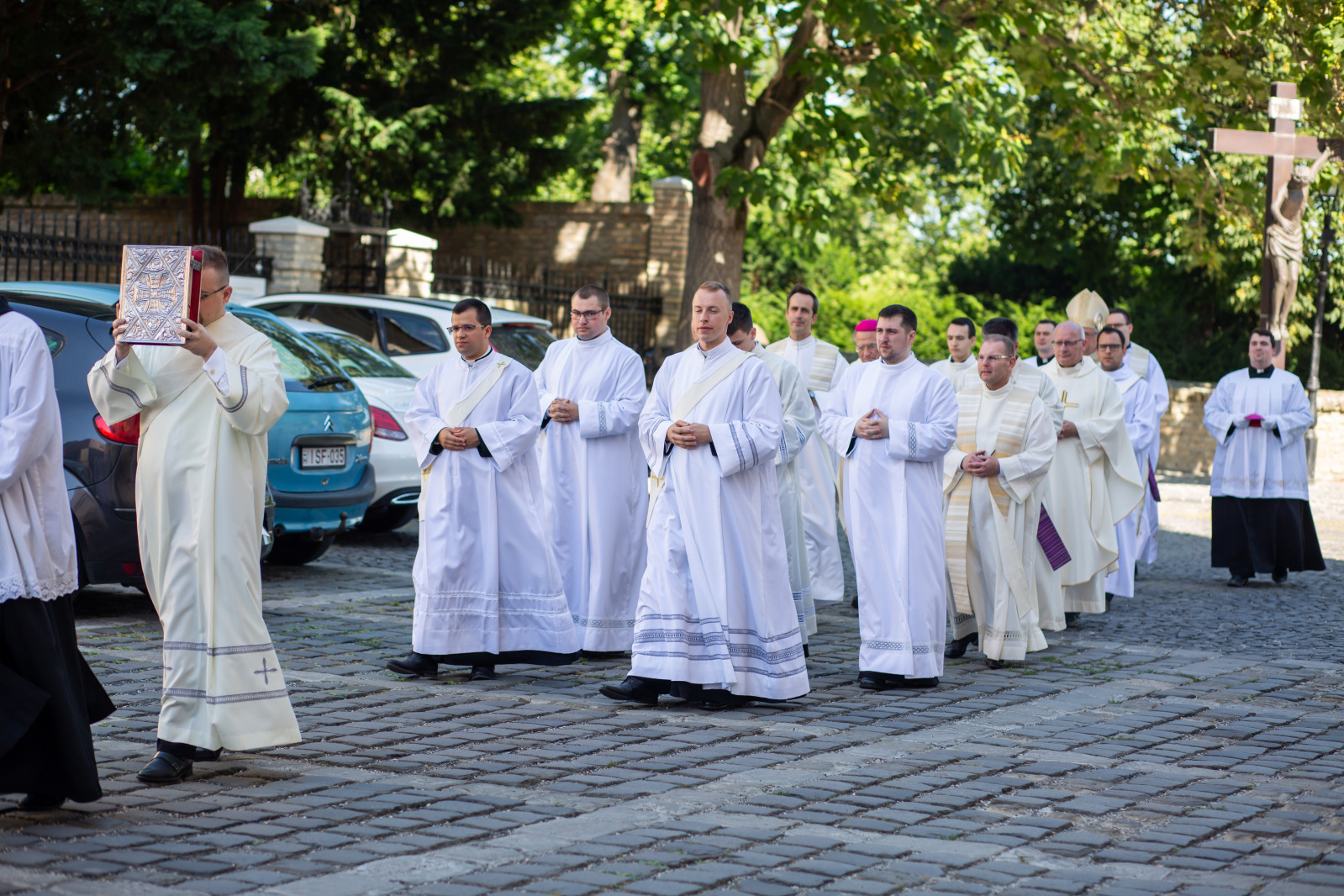 A közbenjáró imát a szentelés legfontosabb pillanata követte: elsőként a szerpapok felett mondta el Veres András a felszentelő imát, kézrátétellel kérve a Szentlélek segítségét, majd megkapták a diakónusok sajátos ruháját, a stólát és a dalmatikát. A megyéspüspök megbízta a diakónusokat Isten igéje hirdetésével, amit az evangéliumos könyv átadása fejezett ki.