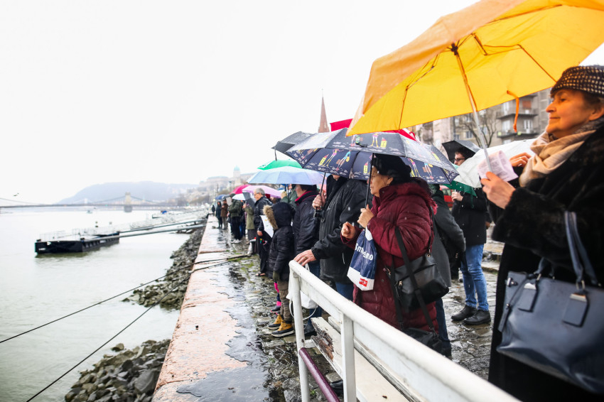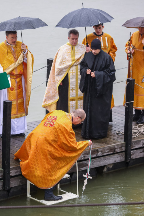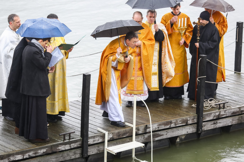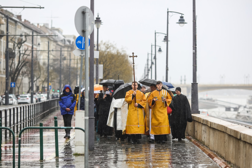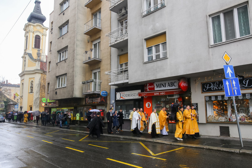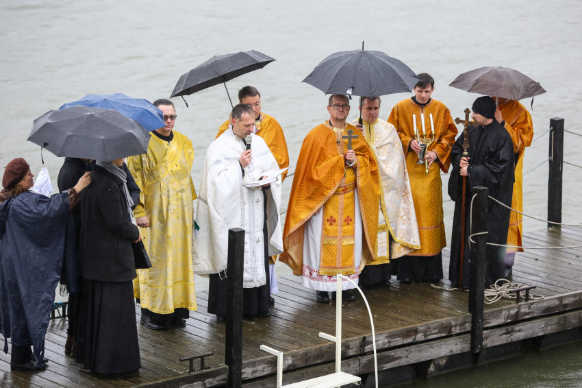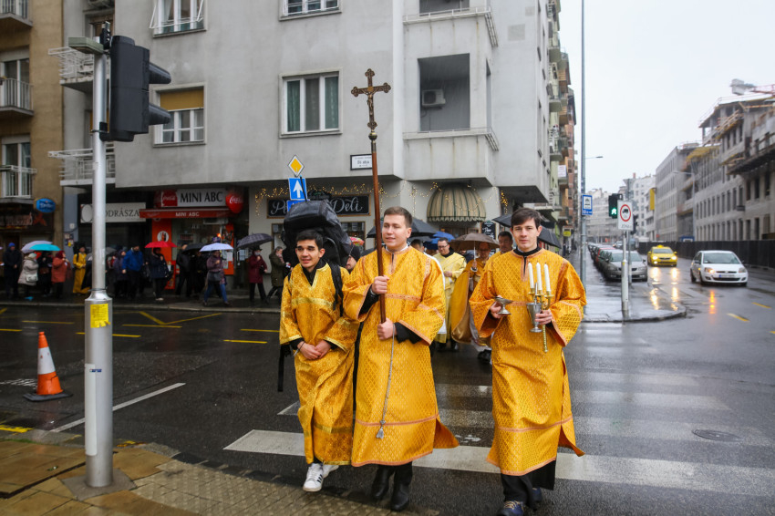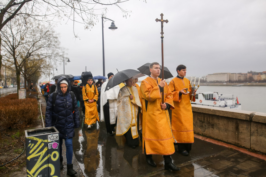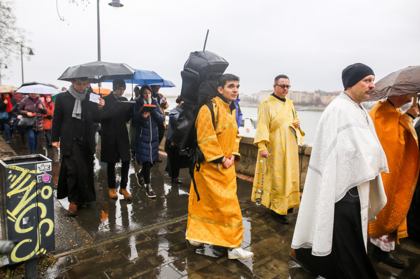 A Szent Liturgia után indult a menet a Dunához. Az eső szakadatlanul zuhogott, miközben a templom papsága és a hívek imádkozva, énekelve végigvonultak a rakparton. „Szentelj meg engem és a vizeket, Üdvözítő” – hangzott fel újra és újra az emberek ajkán.