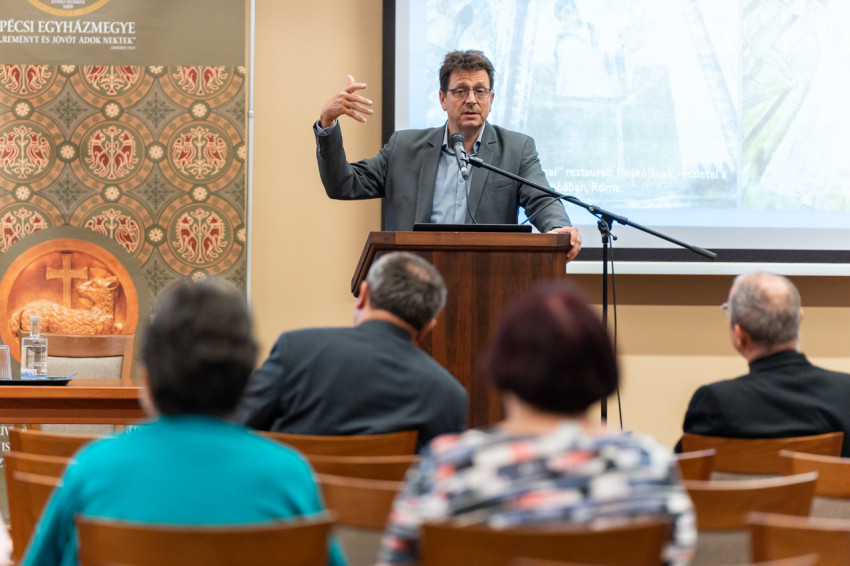 Az előadó saját szakterületéről szólva kiemelte, azt kutatja, hogy az ókeresztény kor embere hogyan használta fel és alkalmazta korának technikáját arra, hogy úgy közvetítse mások számára az isteni szót, hogy valóban meghallják azt. Ennek pedig figyelemre méltó szelete, ahogyan az Egyház közössége kialakította az egyes emberben azt a befogadóképességet, melyen keresztül képes volt meghallani és érzékelni Istent a katakombákból elindult egyszerű ábrázolásoktól kezdve a későbbi századokban keletkezett mesterművekig.