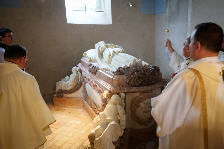 Udvardy György érsek a szentmise elején elmondta: „Hála van a szívünkben. Az évek óta tartó munkálatok jelentős állomásához érkeztünk, a székesegyház és a kultuszhelyek munkálatainak lezárásához. Hiszem, hogy a szentségre törekvést szolgálja, amit tettünk, hívőknek, nem hívőknek, itt élőknek és zarándokoknak egyaránt.” A főpásztor ezután megáldotta a vizet, amellyel meghintette a híveket, a templom falait, az altemplomot, Padányi Biró Márton sírkápolnáját és a püspöki kriptát.