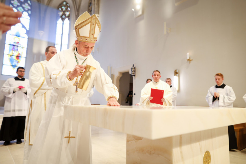 A szentélybe visszatérve a püspök meghintette szenteltvízzel az oltárt is. „Isten, a mi irgalmas Atyánk töltse be jelenlétével az imádságnak ezt a házát. Szentlelke lakozzék templomában, amely mi magunk vagyunk.”