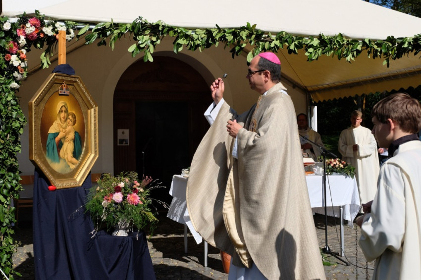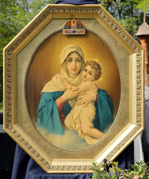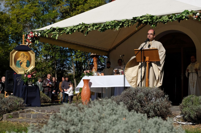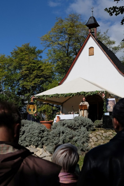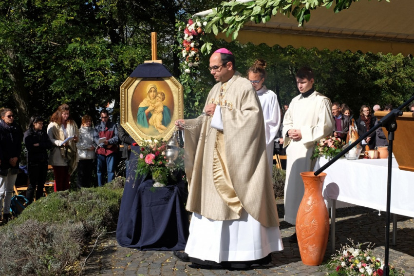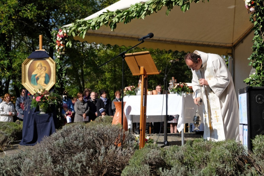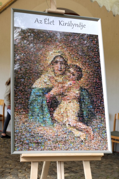 Az oltártól balra a kápolna Máriát és a gyermek Jézust ábrázoló képe, amelyen letakarva már most is ott a Mária feje fölé erősített korona (Zoltán Győző és Kovács Erzsébet ötvösművészek munkája), jobbra pedig egy másik, hasonló Mária-mozaikkép, Az élet királynője felirattal. Közelebbről is megnézem: a mozaikkockák fényképek: schönstattos családokról, papokról, ünnepi eseményekről készült felvételek. Mindenki itt van. A fel-feltámadó szél időnként erősen belekapaszkodik az állványba, amely a képet tartja; nemegyszer úgy tűnik, el fog dőlni, de kiderül, hogy erősen kikötötték és kövekkel rögzítették. A szervezők minden apró részletre gondoltak.