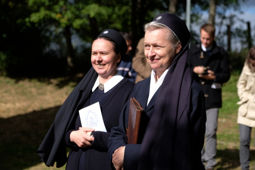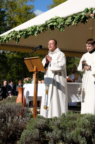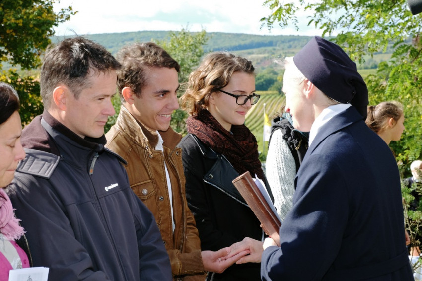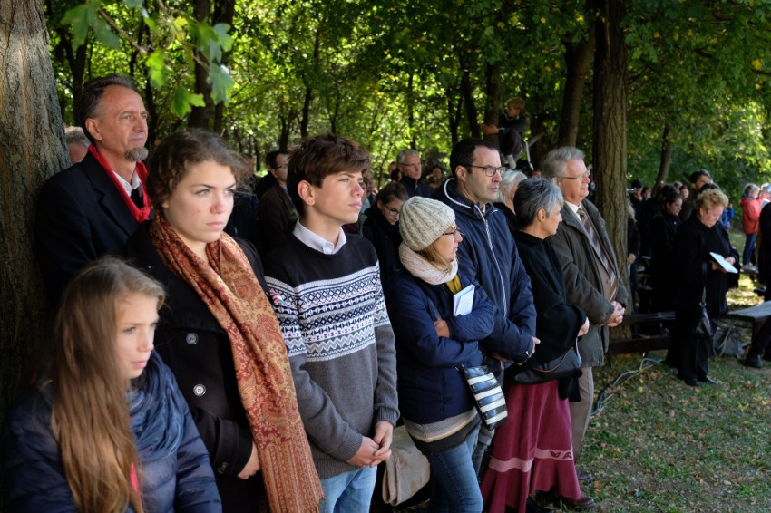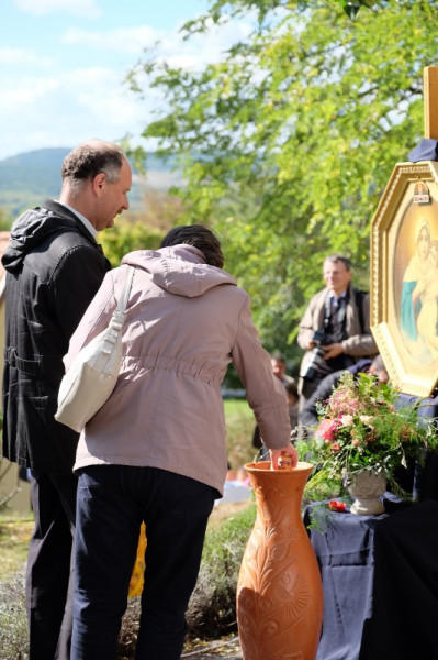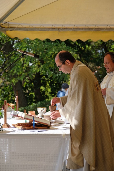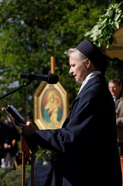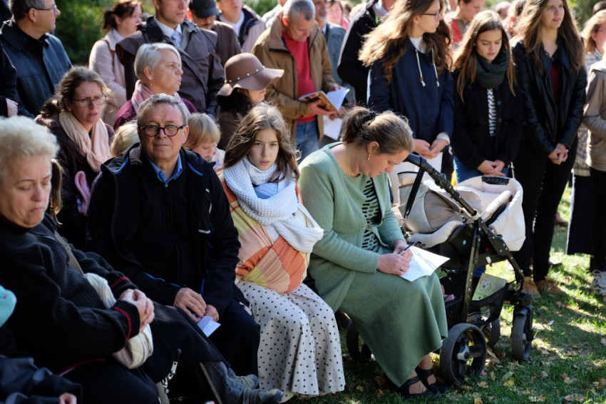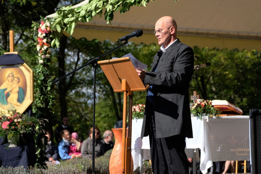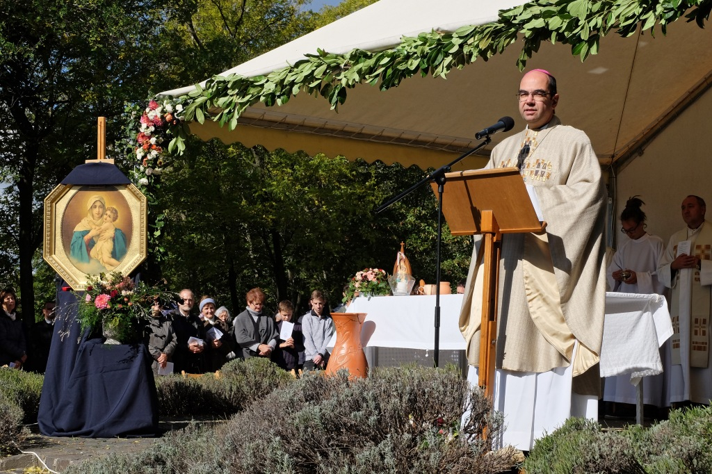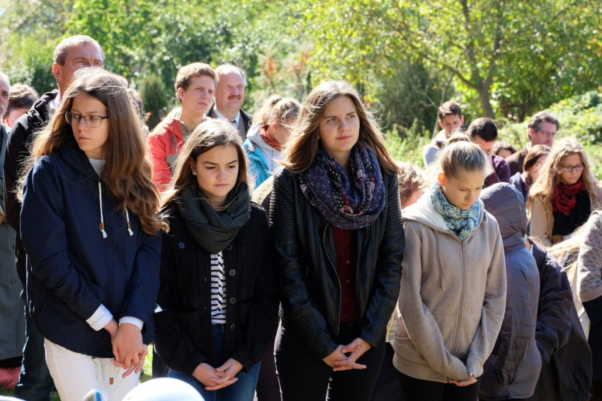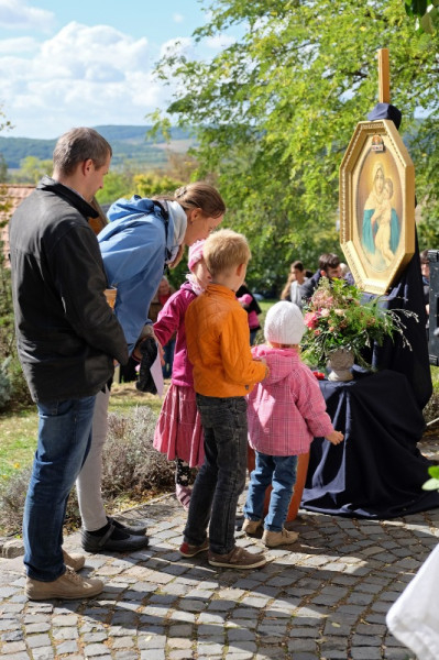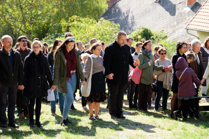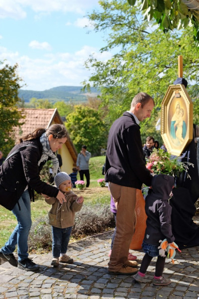 A prédikáció után a „megkoronázott” kegykép leleplezése és megáldása következik, majd néhány schönstattos fiatal szeretetszövetség-kötése Máriával, amelyben Isten anyjának oltalmát kérik. Székely János ezt követő imájában megemlékezik a magyar Schönstatt egyik nemrég elhunyt alapítójáról, Gódány Róbertről, végül pedig Ozsvári Csaba boldoggá avatásáért imádkozik. Aztán megindul a kegykép felé a schönstattos családok korsós menete: bámulatra méltó az az erő és méltóság, amely ebben a „felvonulásban” megmutatkozik. Talán fél óra hosszat is eltart a „seregszemle”, és egészen egyéni színt ad a misének. A személyes elkötelezettség rendhagyó tanúságtételét érzem meg benne.