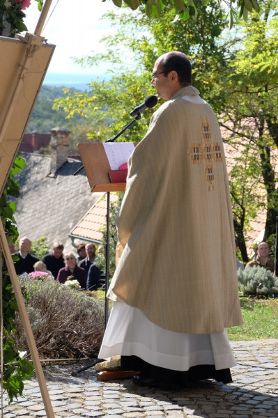 A parkolás nehéz. A völgy, amelybe végül begurulunk, a végső mentsvár, miután kiderül: az út mentén és a házak között az összes lehetséges parkolóhely foglalt. Itt is legalább ötven autó áll két sorban, a háttér idilli: erdők, dombok, maga a Toscanát idéző Balaton-felvidék. A templom felé haladva karám és benne fehér, fekete, barna kecskék meg két fekete-fehér foltos bika mellett haladunk el. Az utóbbiak egyike az összes többi legelészőtárstól legalább hat-nyolc méterre, egyedül és meglehetősen komor tekintettel fekszik. Nem kell sokat várni, és elhúzódásának okára is fény derül. Mellé vágtat és rátör ugyanis a másik, majd egymásnak szegülnek a szarvak. – Bikaviadal! – kiáltja egy kisfiú.