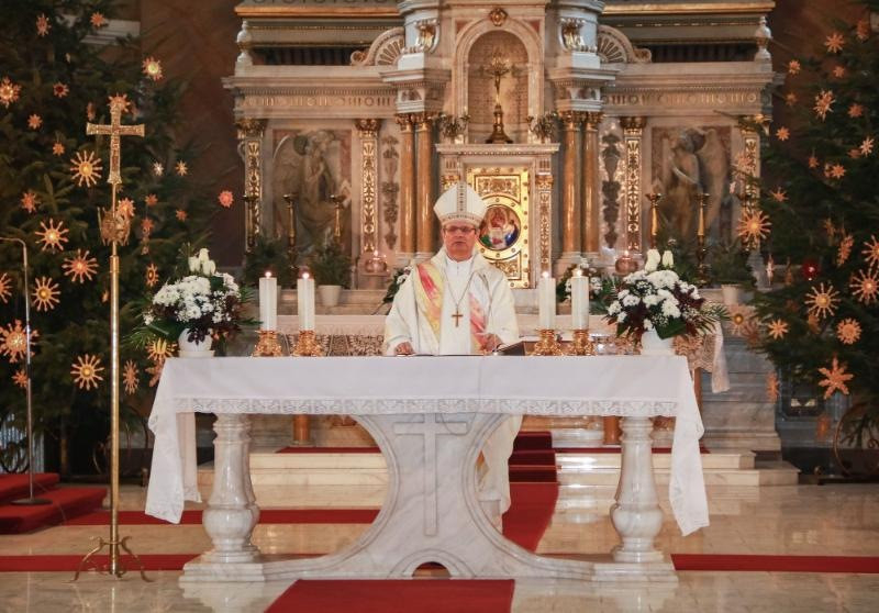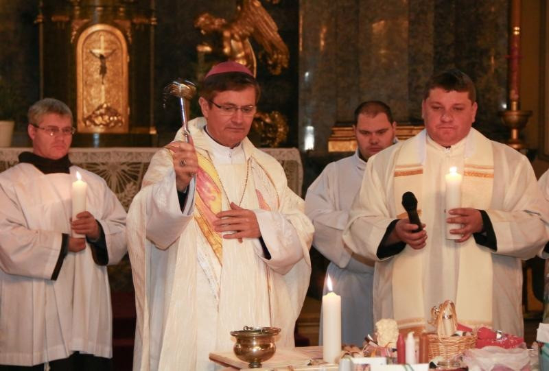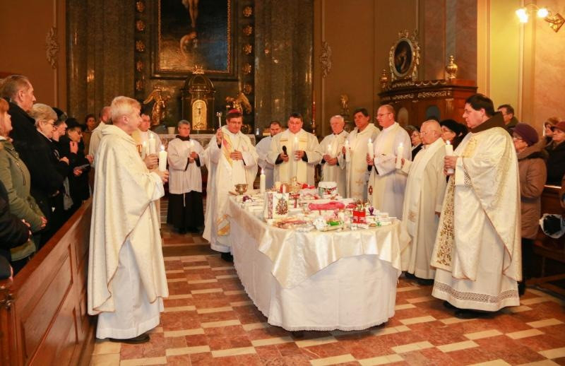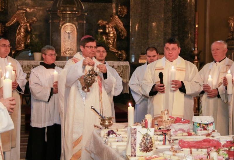 A szatmárnémeti székesegyházban bemutatott ünnepi szentmise elején Schönberger Jenő püspök a jelen lévő papokkal és ministránsokkal a jobb mellékoltárnál felállított asztalhoz vonult, és megáldotta a hívek által oda elhelyezett gyertyákat. Égő gyertyával a kezében és szenteltvizet hintve indult aztán a főoltárhoz.