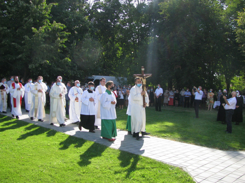 Augusztus utolsó vasárnapján székek és padok sorakoztak katonás rendben, a koronavírus-járvány megfékezését célzó hatályos rendelkezések értelmében egymástól megfelelő biztonsági távolságra a templom előtti frissen nyírt, zöldellő pázsiton. A sors furcsa fintora, hogy azok közül, akik oly sokat fáradoztak céljuk megvalósításán, végül csak korlátozott számban vehettek részt a templomhajóban celebrált szentelési szertartáson, az egybegyűltek jelentős többsége hangszórók segítségével kapcsolódhatott be a szentmisébe.