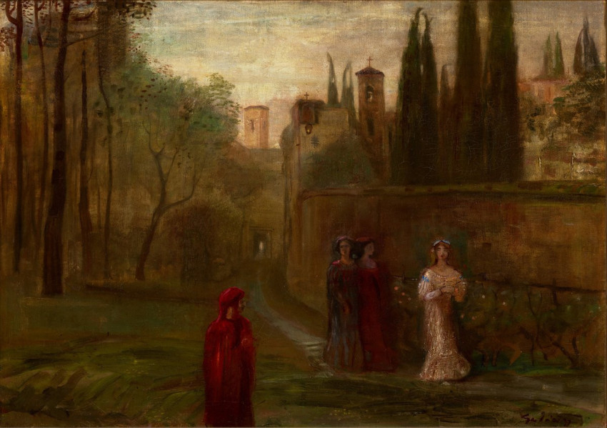– Dante halotti maszkjának sokat vitatott másolatát a Palazzo Vecchióban őrzik, üvegszekrénykébe zárva. Ez már átvezet bennünket Gulácsyhoz, aki nagy hódolója volt az olasz poétának. Itáliai útjai során érhette a termékenyítő hatás, de a sokrétű Dante-kultusznak idehaza is tanúja lehetett a századelőn. Őt is vonzották a kultúra nagy korszakai, a preraffaelitákhoz hasonlóan a középkor különösen. Számára a múltba merülés a teremtő fantázia játéka, amit sikerrel ültetett át témákba, formákba, motívumokba. Törvényszerű volt, hogy Dante monumentalitására is rátalált. A hagyomány szerint a Szentírás mellett az Isteni színjátékot is magánál tartotta, arról pedig, hogy a költő líráját is ismerte, egyik legszebb képe, a Dante és Beatrice találkozása vall. Más műveiből is kiolvasható a Dantéhoz való kötődés, így például a Paolo és Francesca címűből, amely az életmű egyik legszebben kidolgozott darabja. Gulácsy dantizmusa azonban több mint hatáson alapuló invenció. E szellemi-lelki kapcsolat különös, bizarr jele, hogy maga is készített egy fiktív Dante-maszkot, melyet a Magyar Nemzeti Galéria őriz. Ez mutatja legjobban, hogy a költőelőd iránti rajongás és a saját személyiségében való, festői elmélyülés mennyire közelít egymáshoz. Nem bizonyítható, de sejthető az azonosulási törekvés egy ifjúkori önarcképén is. Székely Aladárnak van egy igen beszédes fotója a különc Gulácsyról: sötét szobában, egyetlen gyertya fénye mellett, reneszánsz jelmezben ül a magyar festő, mellette régi tőr és nyitott könyv. Testtartása ernyedt, szinte önkívületlen, szeme behunyva. E két utóbbi motívum régi ábrázolási sémaként ismeretes a művészet történetében: a földi dimenzióból kiragadott, mert az ihlet szent pillanatát átélő költőé, akihez a magasból épp a Múzsa szól.